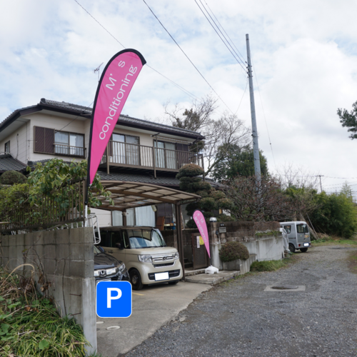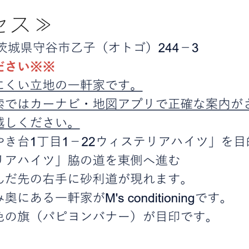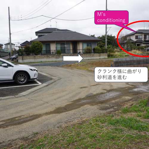 ③道なりに進んだ先の右手に砂利道が現れます。砂利道を進み奥にある一軒家がM's conditioningです。濃いピンク色の旗(パピヨンバナー)が目印です。