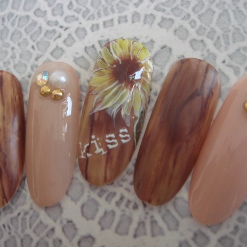 ひまわりと木目調ネイル