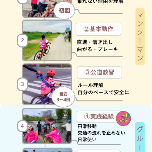 →マンツーマン指導専門の自転車教室です。緊急性・深刻度・その他ご事情ご相談ください。