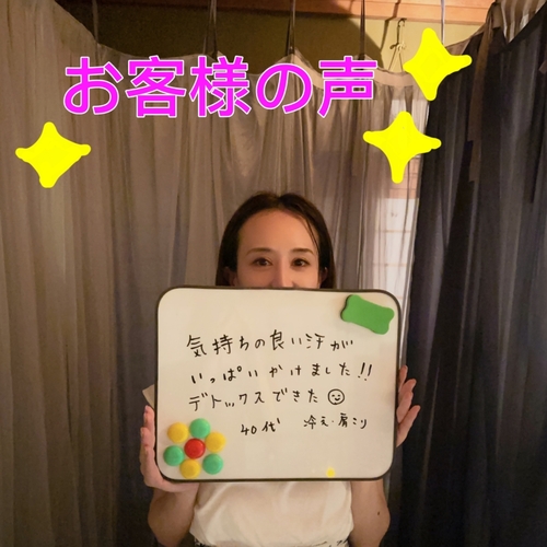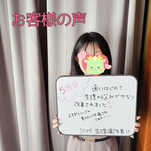 お店に入った瞬間からいい匂いがし、とてもリラックスできました。よもぎ蒸しも、想像以上に良くて家に帰ってからも体がポカポカで、いつも眠りが浅く夜中に1.2回は起きてしまうのが朝までぐっすり眠れたことがとても嬉しかったです。目覚めもスッキリでびっくりしました。ありがとうございました。また宜しくお願いします。