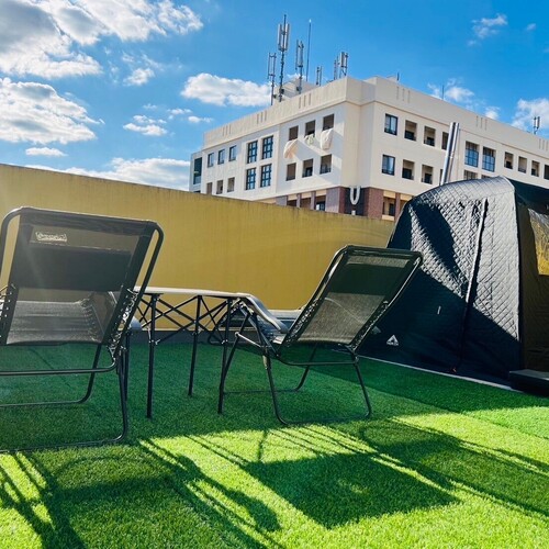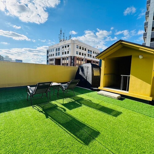 屋上は小さなビニールプールやサウナがあり、人工芝のような床と椅子やテーブルもあり、昼間のイベントに使えそうな感じです。