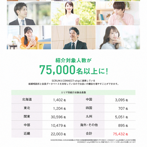 市川市など東葛地域を中心に、地元に根ざしたサポートに加え、TMS加盟店として全国の出会いもご紹介可能。初婚はもちろん、再婚やシングルマザー・ファザーの方も歓迎です。