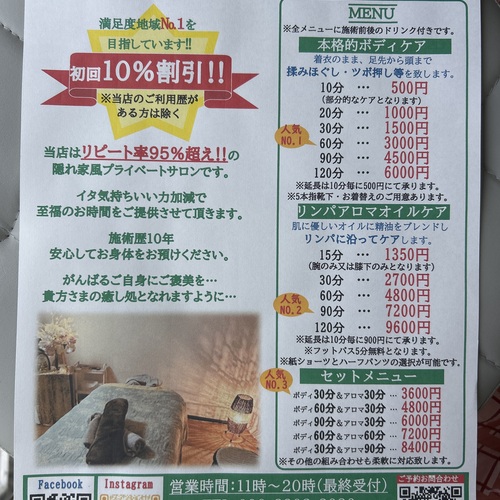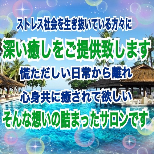 『深い癒しを提供する事』『真心を込める事』を信念にしており、おかげさまでリピート率95%越えと言う、非常に施術者冥利に尽きるありがたい結果となっています。
