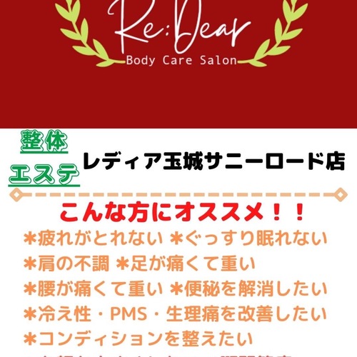 カラダの歪みや不調の根本からケアしていくことで、体本来の力を高めていきます。Re:Dear玉城では、整体・コルギで体の中からの不調を改善し、人気のよもぎ蒸しは黄土座椅子を使用。内側からのキレイを導いていきます。