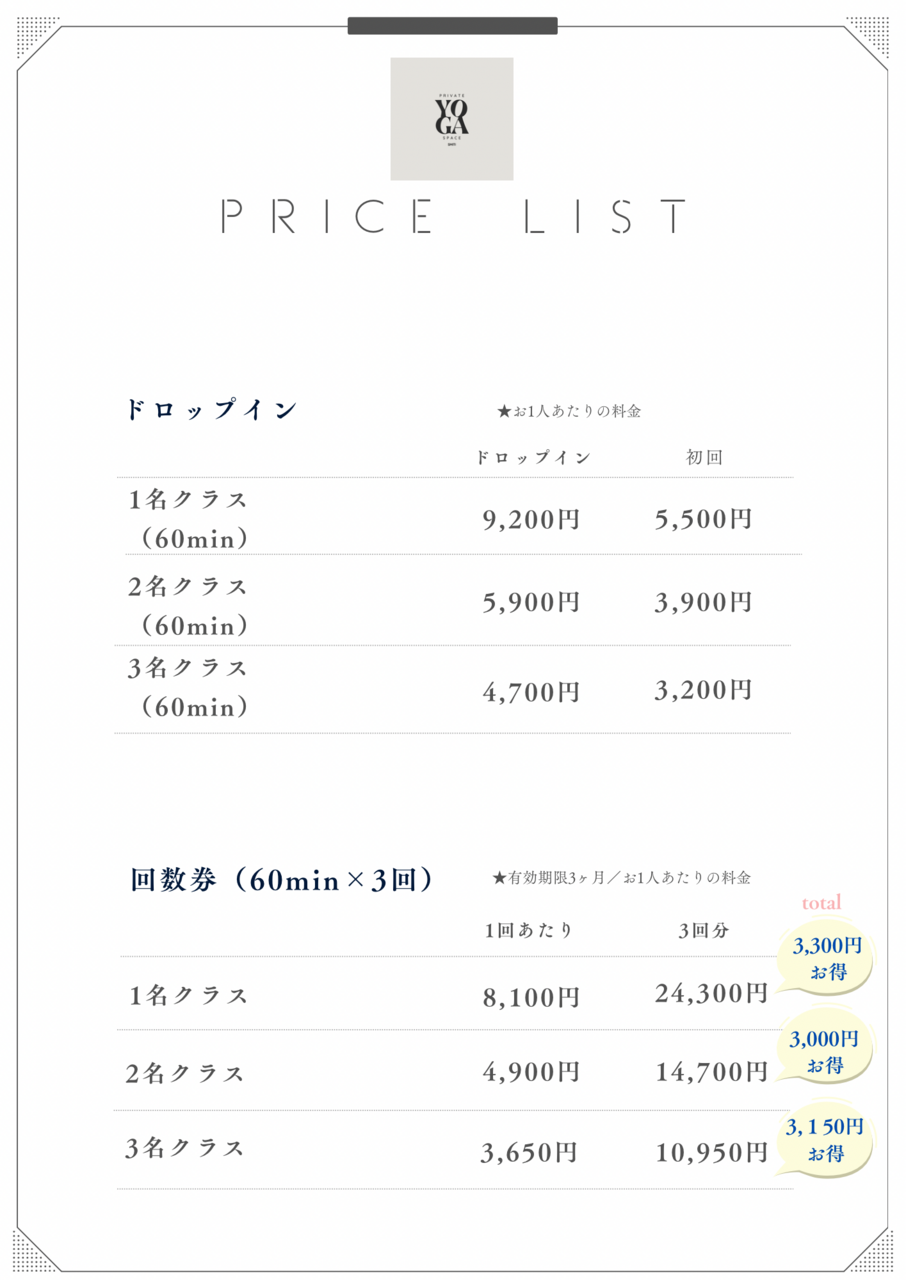 《Price List 料金表》