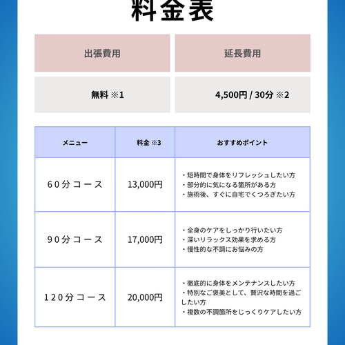 施術内容や料金など、詳しくはホームページまたは各メニューの詳細をご覧ください。