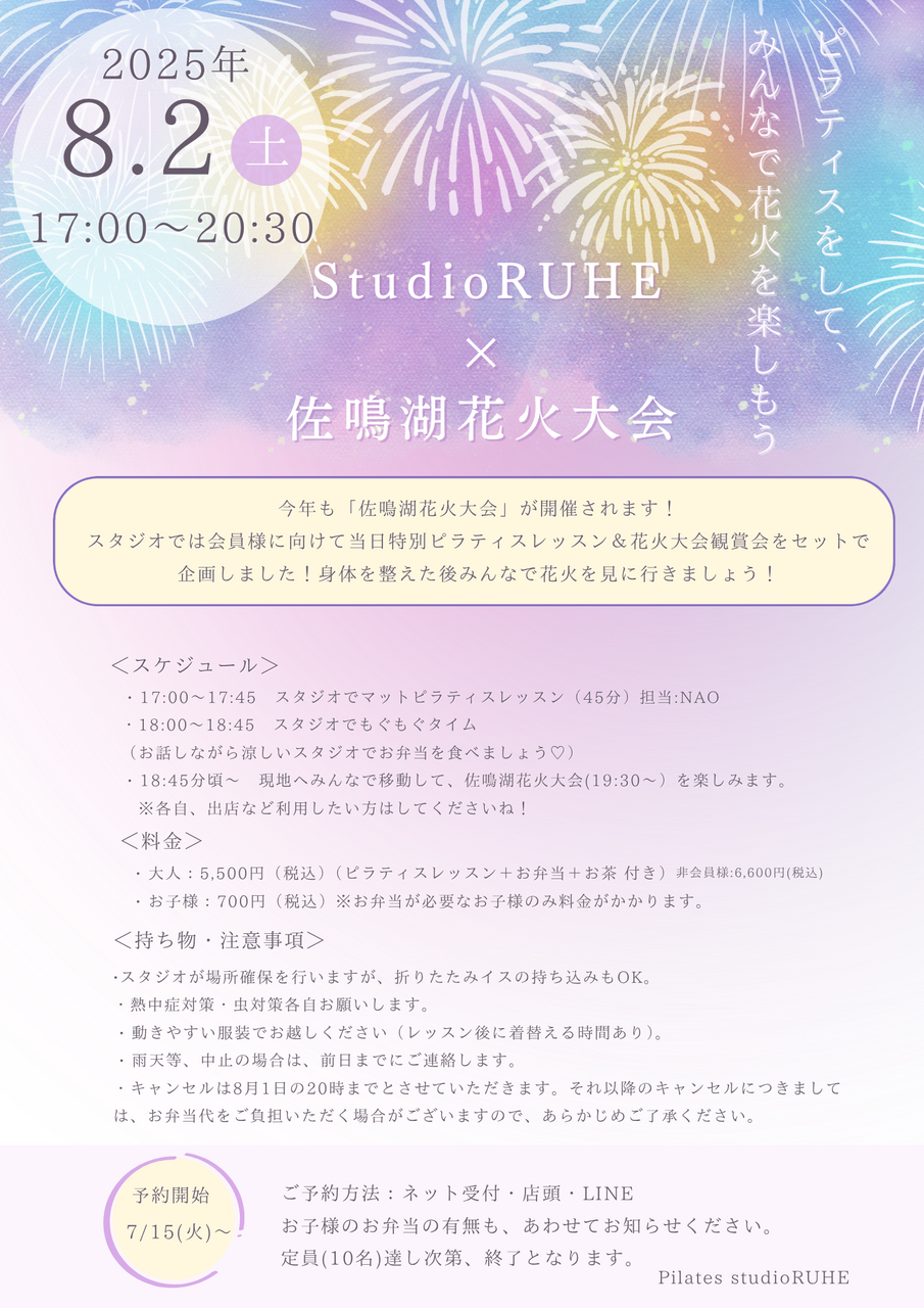 【8月2日イベントのお知らせ】佐鳴湖花火大会 × 特別ピラティスレッスン