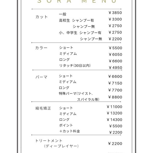 Soraは女性スタイリスト1人で営業しております。お客様のお悩みをお伺いし丁寧に対応致します。
