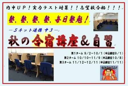 9月より、「“Sネット連携 秋の合宿講座&自習”」という中3塾生対象のオプション講座を開講しています。