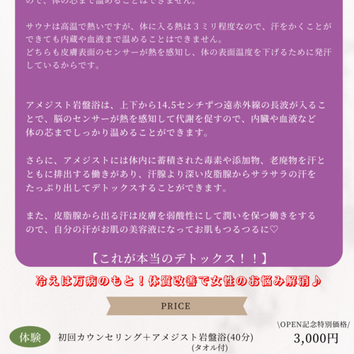 アメジスト岩盤浴は、上下から14.5cmずつ遠赤外線の長波が入ることで、脳のセンサーが熱を感知して代謝を促すので、内臓や血液など体の芯までしっかり温めることができます。