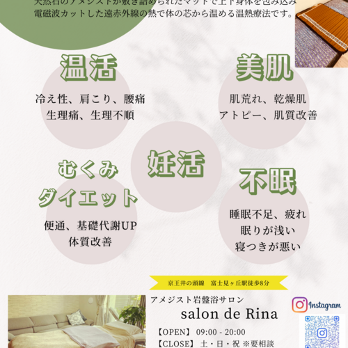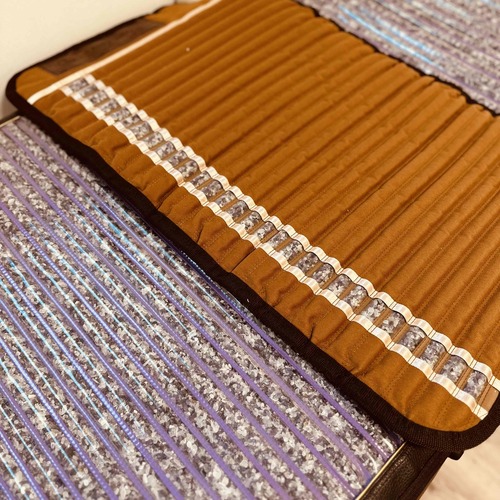 天然石のアメジストが敷き詰められたマットで上下身体を包み込み、電磁波カットした遠赤外線の熱で体の芯から温める温熱療法です。