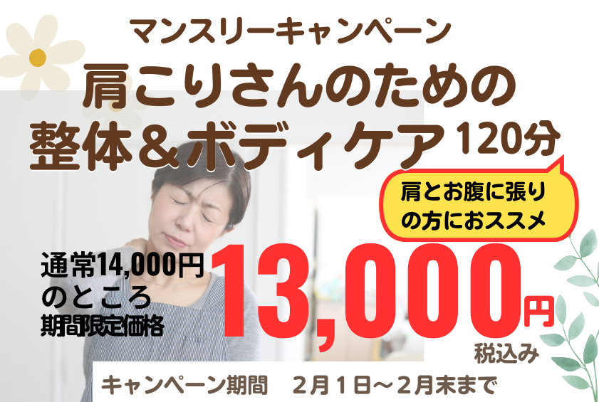 【2月キャンペーン】肩こりさんのための整体&ボディケア
