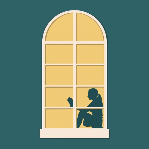 本を読んでスツールに座っている女性のシルエットと白のアーチ型の窓
