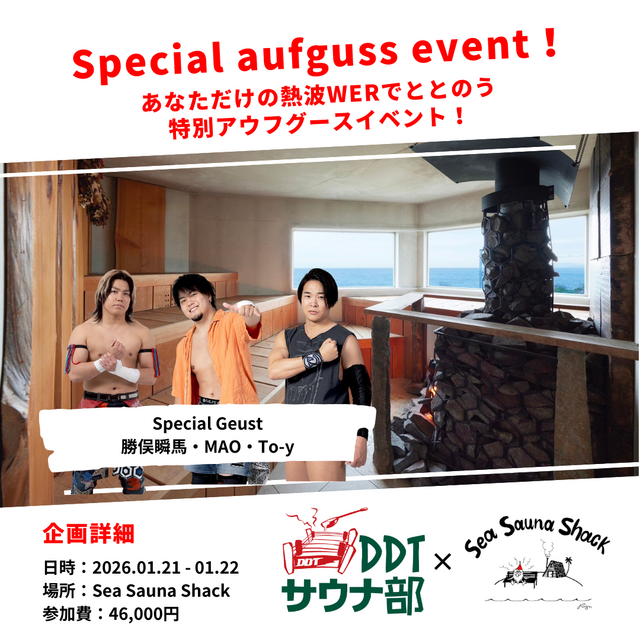 DDTプロレス所属のサウナ大好きプロレスラー『DDTサウナ部』と貸切サウナで交流できる特別アウフグースイベント。