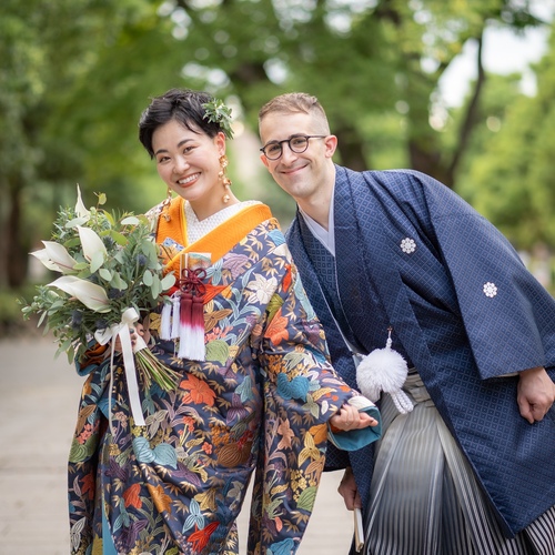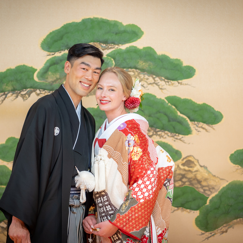 サロンでは日本の結婚式にも使用される本格的な着物や和小物を取りそろえています。 当日は専門のスタッフが着付けをさせていただきます。美しく伝統的な着物の着用体験をお楽しみください。