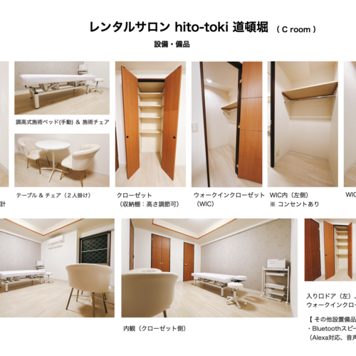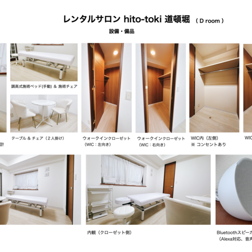 ▶︎施術ベッド(手動昇降式)・施術チェア・カウンセリングテーブル&チェア・体組成計・ホットウォーマー・エステワゴン・Bluetoothスピーカー(Alexa対応)・ウォークインクローゼット・ロッカー(OP)