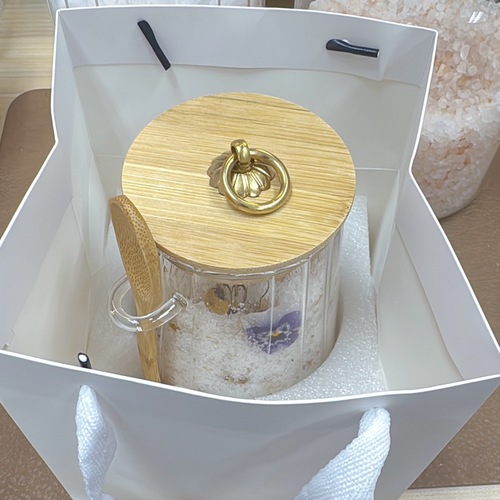 ガラス瓶に詰めた入浴剤は、そのまま飾っても美しく帰ってからお風呂に入れてゆっくりと楽しめます。