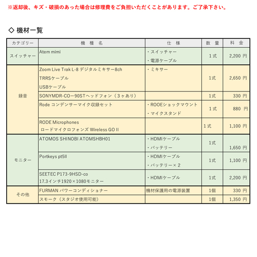 録音機材・スイッチャー・その他 レンタル料金一覧表