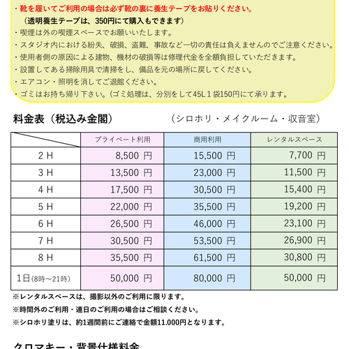 スタジオレンタル・クロマキーグリーン・黒幕・背景スクリーン料金表・注意事項(必ずお読み下さい)