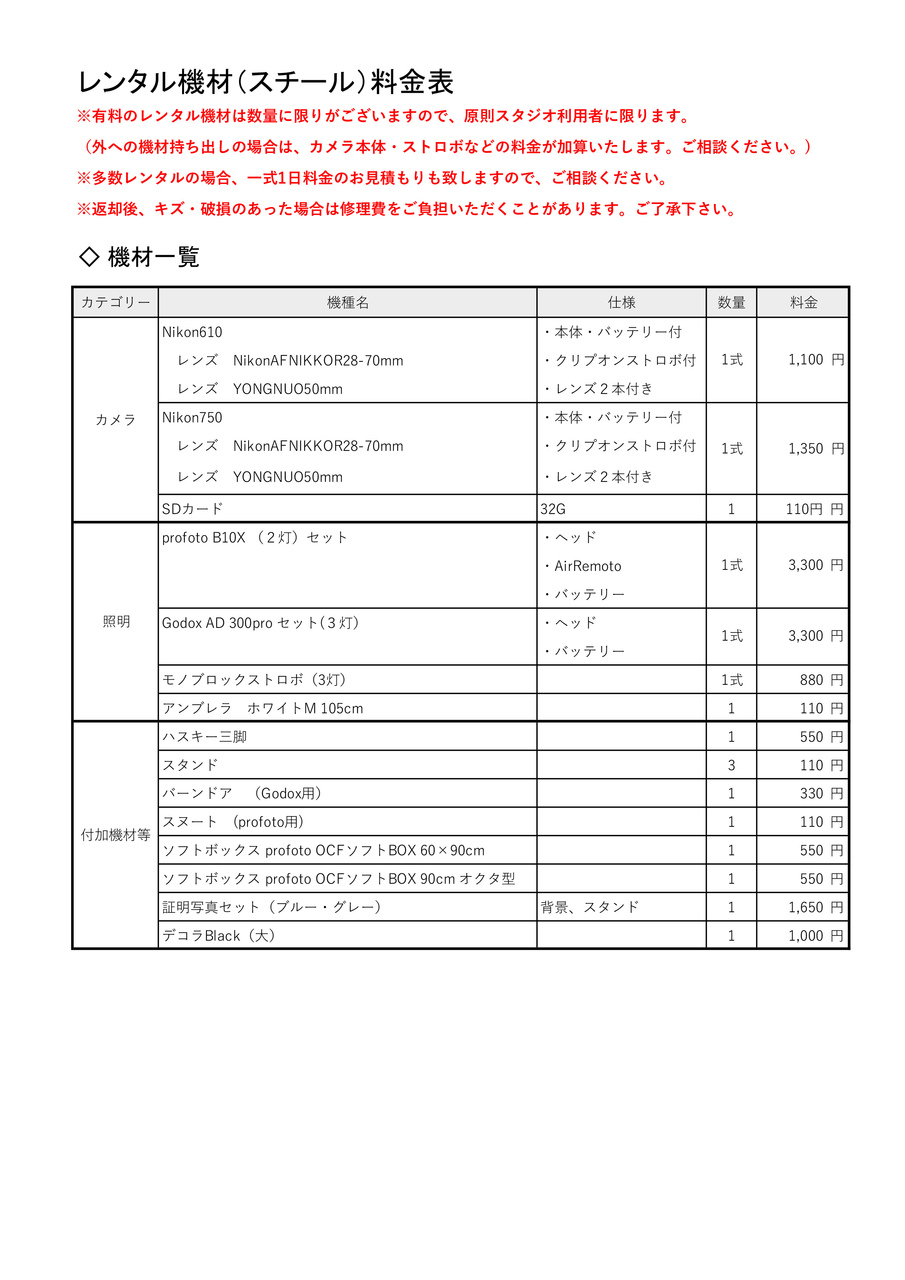 スチール機材レンタル一覧表