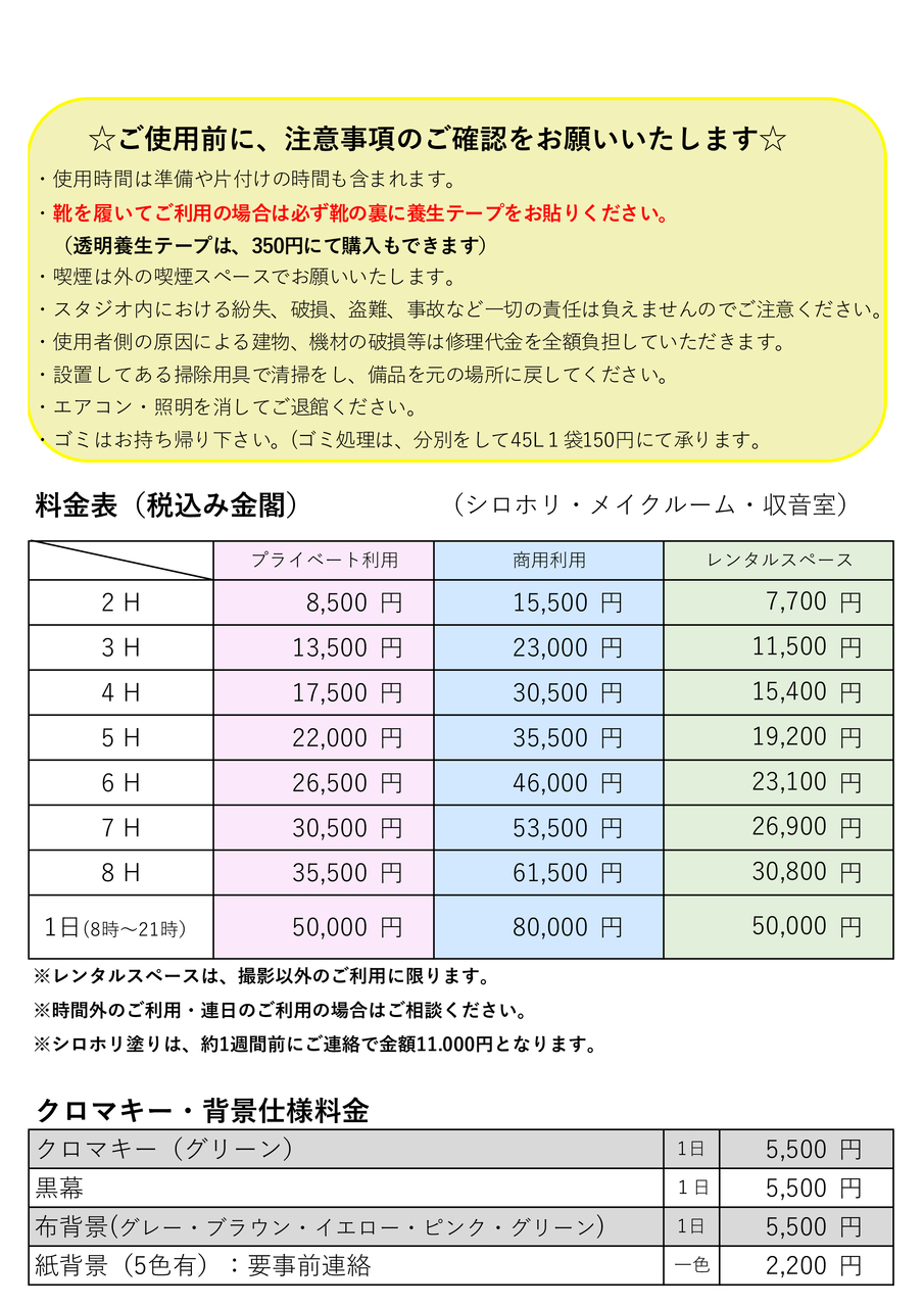 スタジオレンタル・クロマキーグリーン・黒幕・背景スクリーン料金表・注意事項(必ずお読み下さい)
