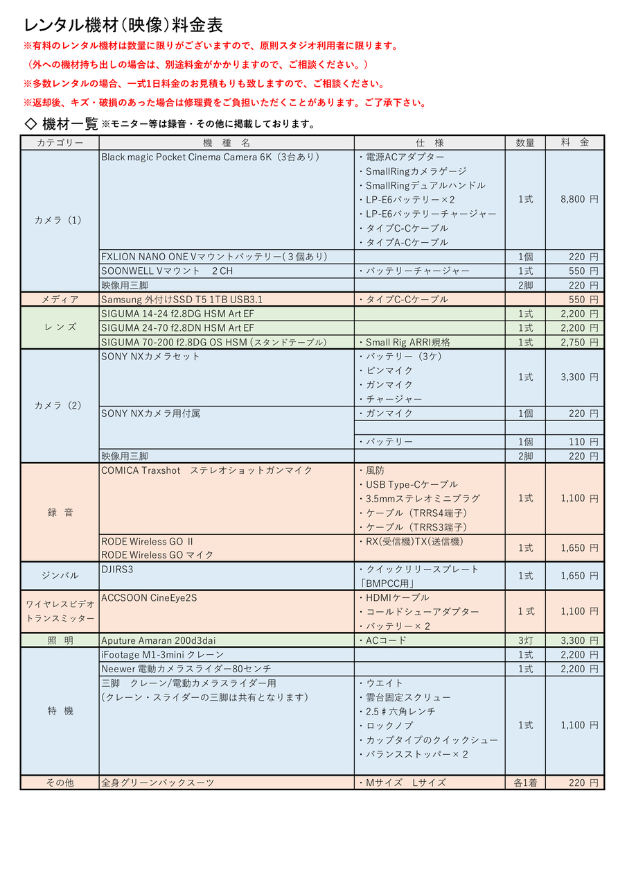 映像機材レンタル料金一覧表