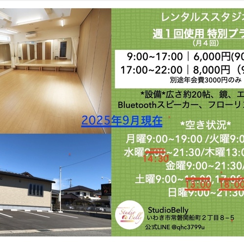 いわき市常磐にあるベリーダンススタジオです。ベリーダンスレッスンのない時間帯はレンタルスペースとしてご利用いただけます。他にダンス用品の販売をおこなっています。