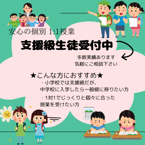 また支援級、発達障がい等をお持ちのお子様、随時ご相談受けつけております。中学生から一般級へ移りたい方などお気軽にご相談ください。