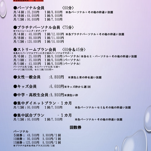 引き締め、ダイエットはもちろん、機能性向上やボディーケアまで幅広く対応致しますので、どんなお悩みでもお気軽にご相談下さい。心から太陽のように明るくなれるジムを目指して、日々自身の技術を磨き上げてお待ちしております。