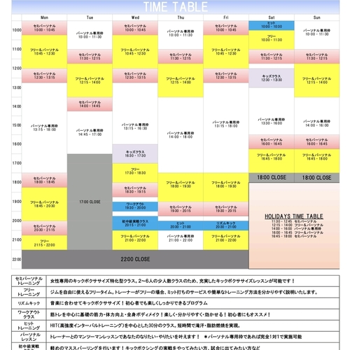 男女フリートレーニング、パーソナルトレーニング、キッズクラス、参加自由型の各種筋トレ&引き締めクラスも充実。
