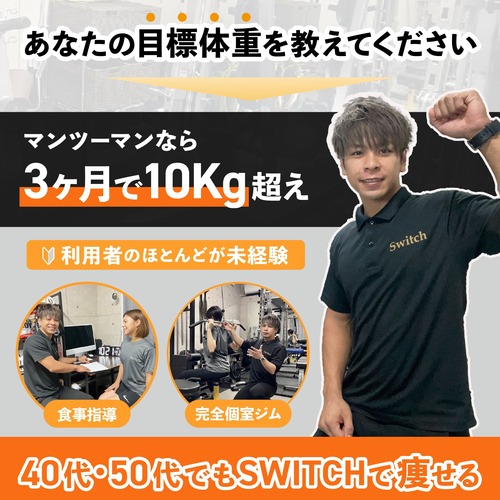 ダイエットジムSWITCH(スウィッチ)は、短期集中ダイエットを目的とした専門パーソナルジムです。