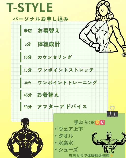 お着替え→体組成計→カウンセリング→ワンポイントストレッチ→ワンポイントトレーニング→着替え→アフターアドバイス