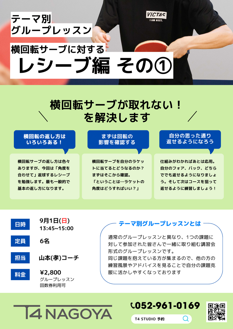【テーマ別グループレッスン】9月1日(日)/山本孝コーチ:横回転サーブに対するレシーブ編~part1~