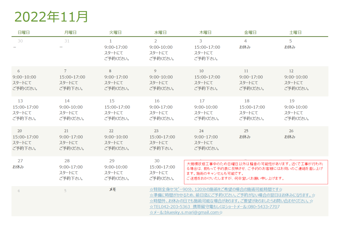 2022年11月のカレンダー