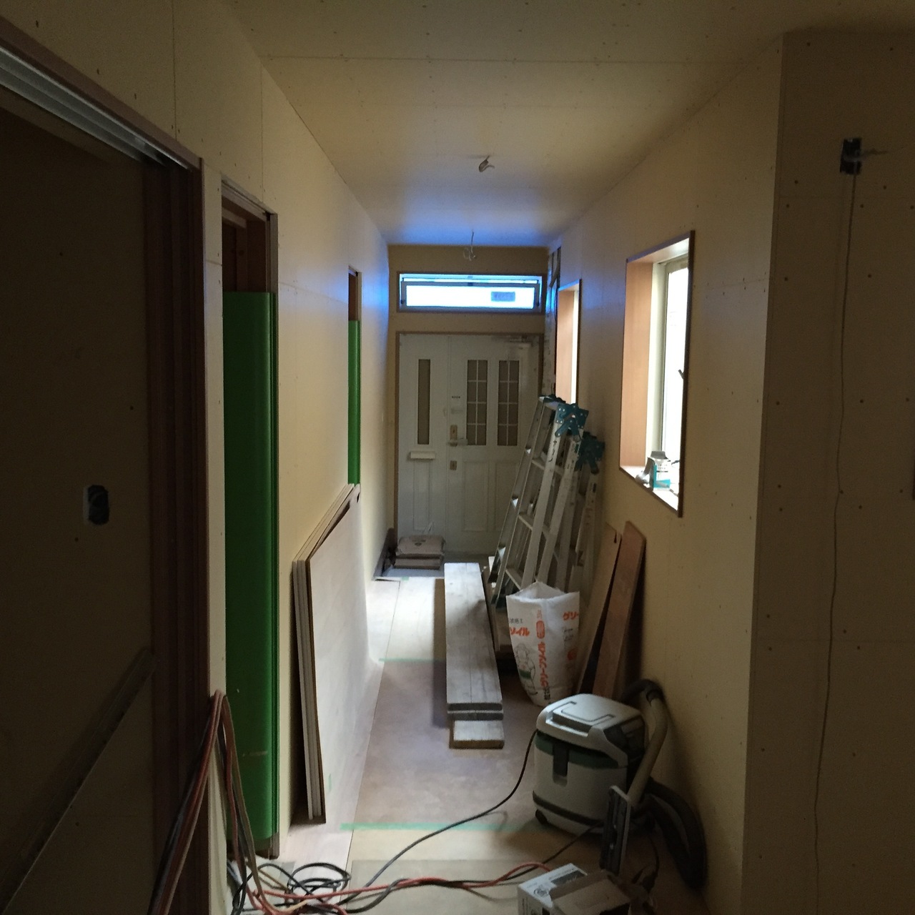 内壁に石膏ボードが張られ部屋らしくなってきました。写真は入口奥から入口ドア方向を撮影。完成が近づいてきたなって感じです。左手前の緑色した保護カバーがウタ健ルーム(SIN)、玄関側の緑保護カバーの入口がウタ健ルームHAKU、夜は簡易ステイになります。