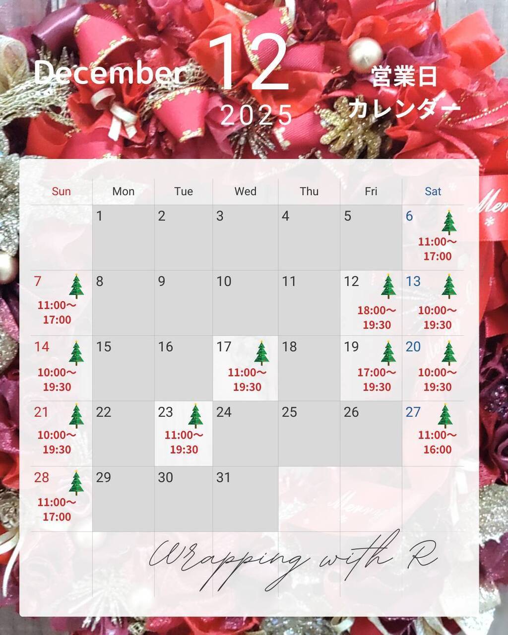 | 2025/12/17(水) | 11:00 - 19:30 |