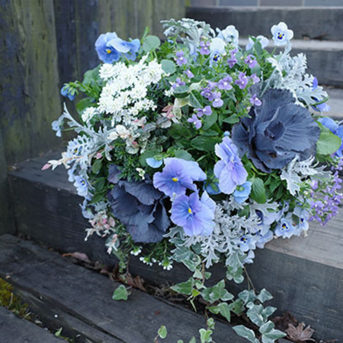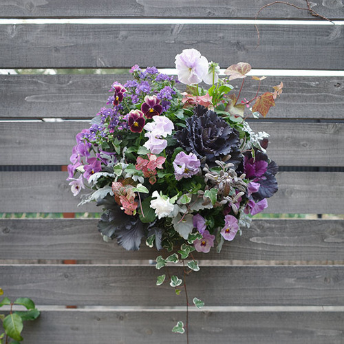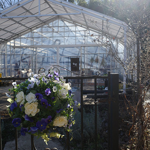 当店がプロデュースするのは、四季折々の多彩な草花を組み合わせた寄せ植えやハンギングバスケット。