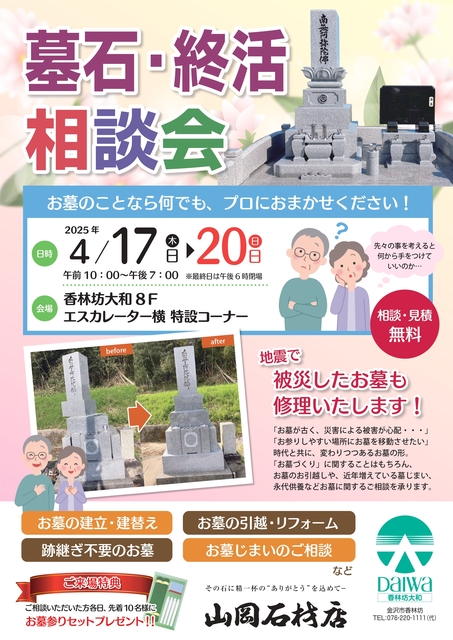 「お墓の相談会 in 香林坊大和」4月17日~20日開催!墓石の修繕・クリーニング、お墓じまい・永代供養など、お墓に関するお悩みを無料で相談できます。