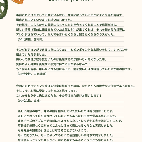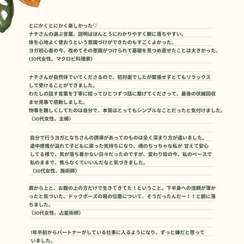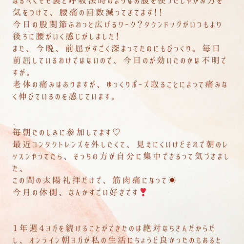 若い時にして以来のヨガでした。からだのあちこちが凝り、関節が硬くなってて、今の私に超超必要!日頃置き去りにしている「からだを感じる」という感覚がとても気持ちよかったです💖続けたいと思います😊
