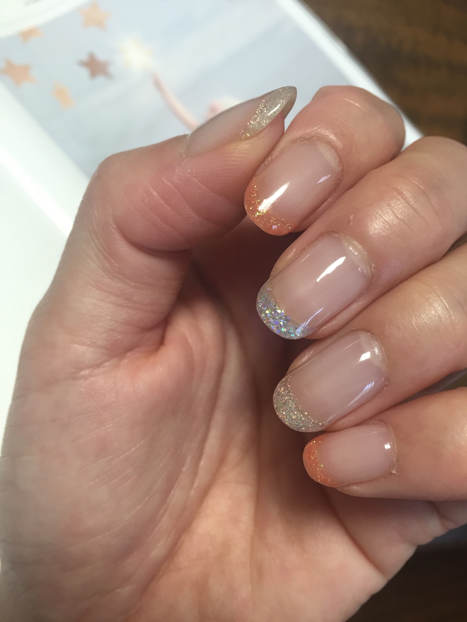 淡いトーンのラメを先端にのせています。色も抑えめで控えめな輝きなので、ラメでも子供っぽくならずにつけられますよ!