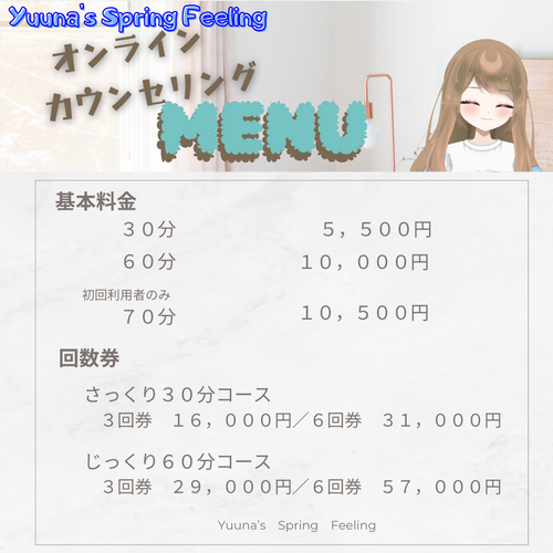 Yuuna's Spring Feeling – カウンセリング・ご相談は、幅広いお悩みに寄り添うオンラインカウンセリングサービスです。メンタルヘルス、自身の考え方の癖、生活習慣(お酒、たばこ、睡眠、ダイエット等)、対人関係、日常生活の愚痴など、どこに相談すべきかわからないお話でも気軽にご相談いただけます。国家資格である公認心理師の有資格者が、病院やクリニックに行くのはハードルが高いと感じる方にも寄り添い、一緒に考えを整理します。メンタル面での困難を経験したカウンセラーならではの共感力と高い傾聴力が特徴で、話がまとまっていなくても安心してお話しください。